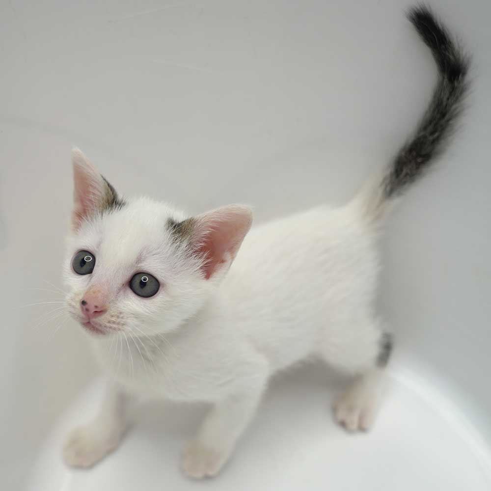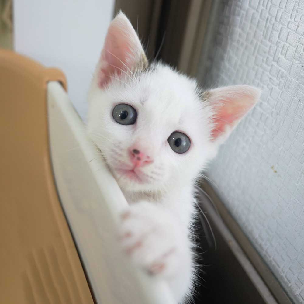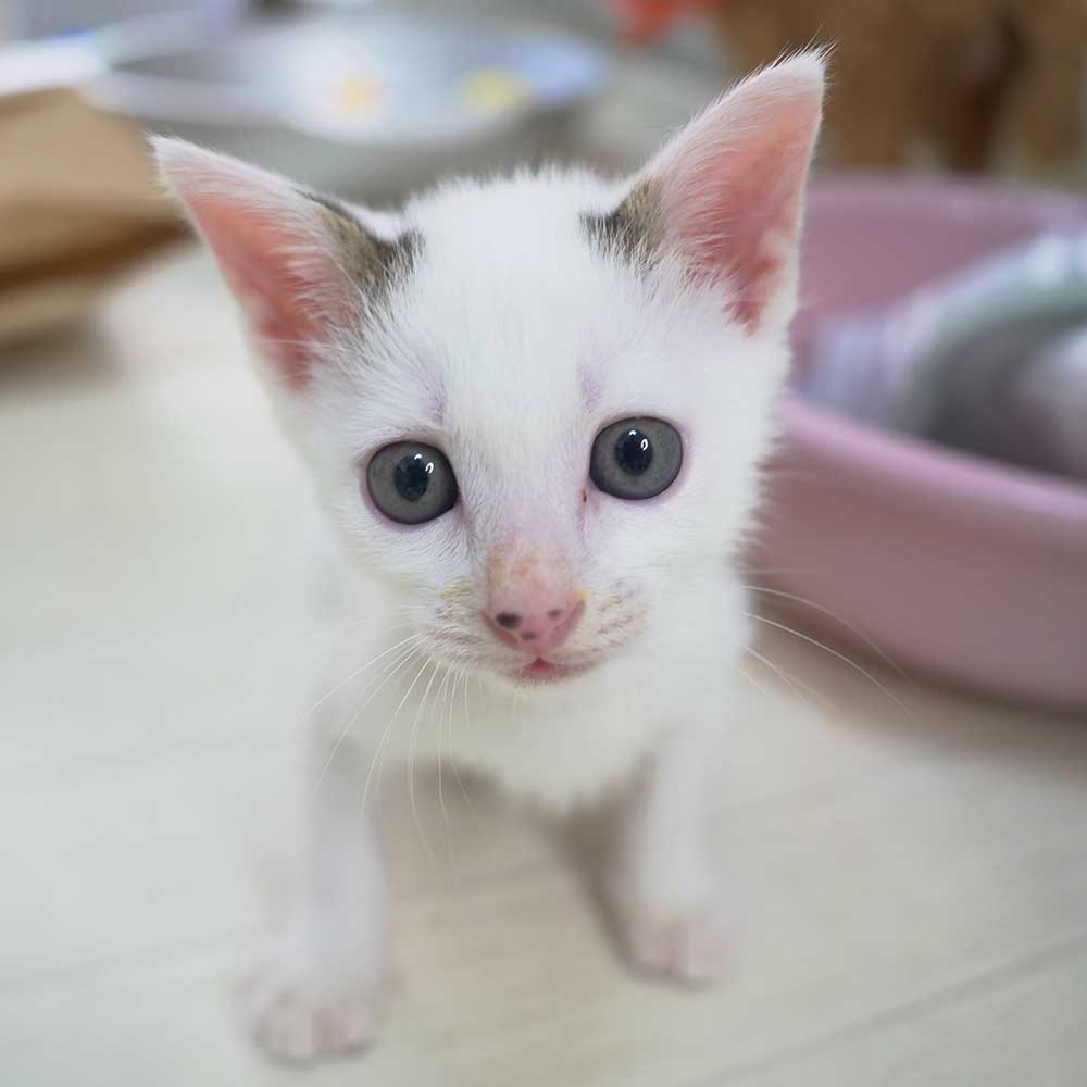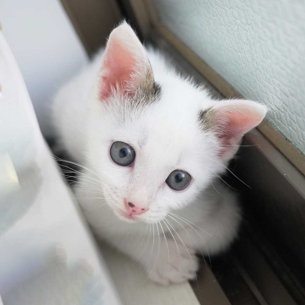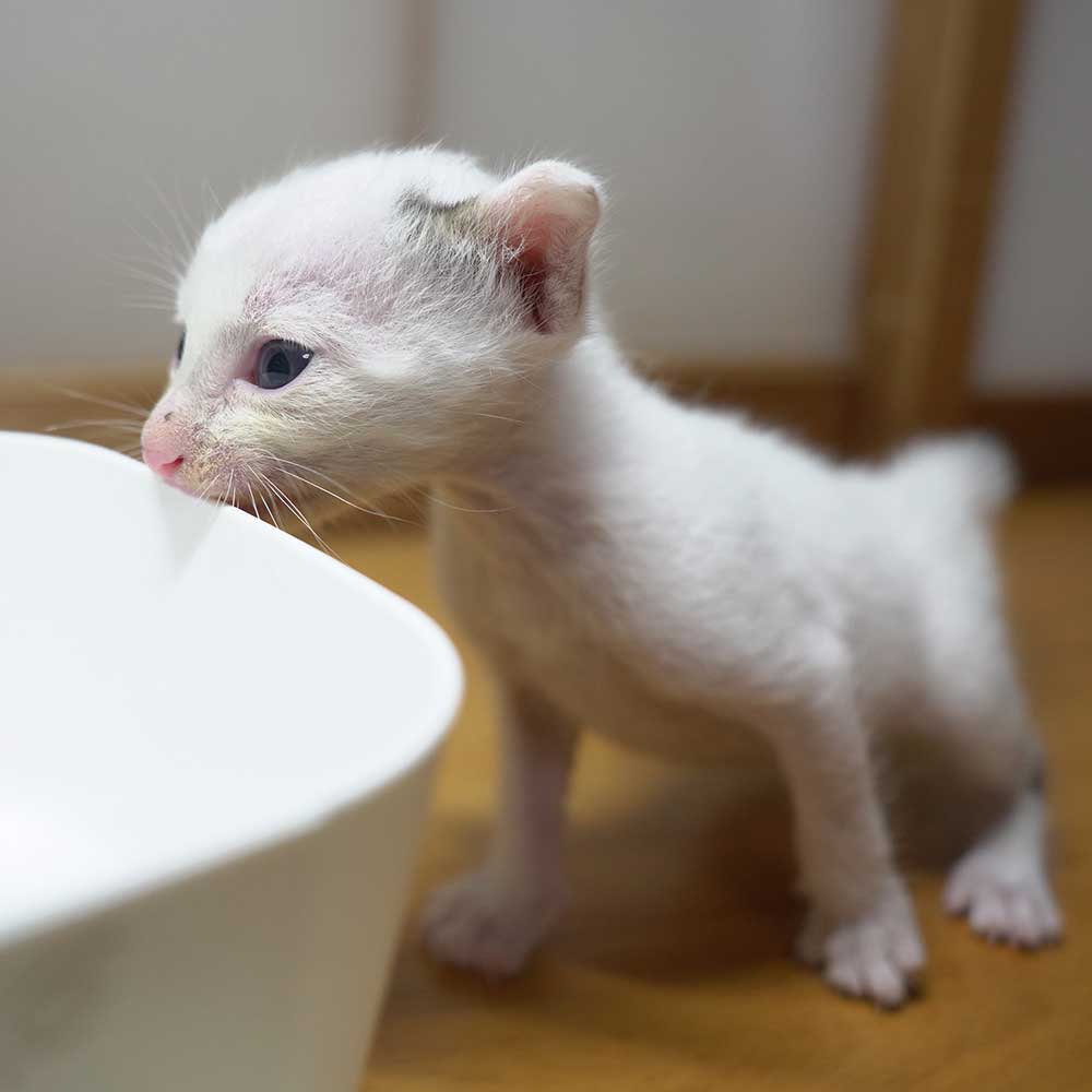 ある激しい雨の日、民家の裏手で2日待っても母猫が帰ってこず、お腹を好かせて鳴いているところを保護。