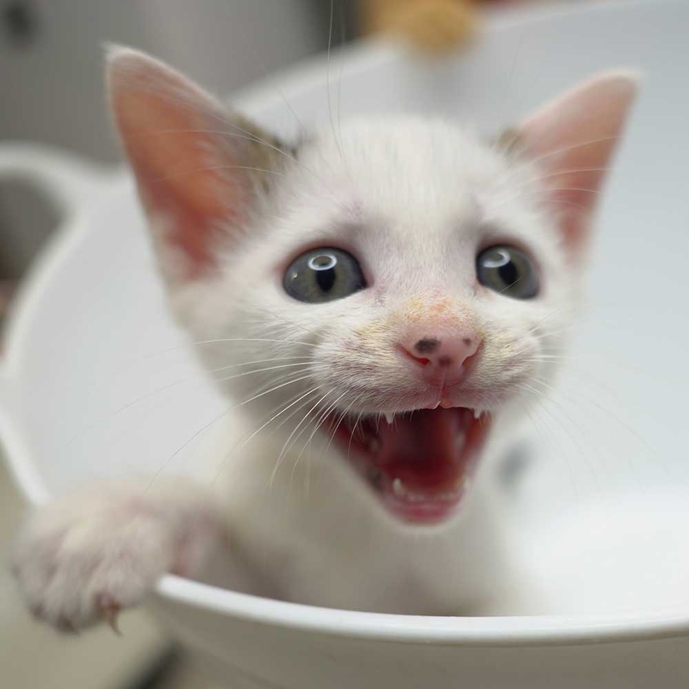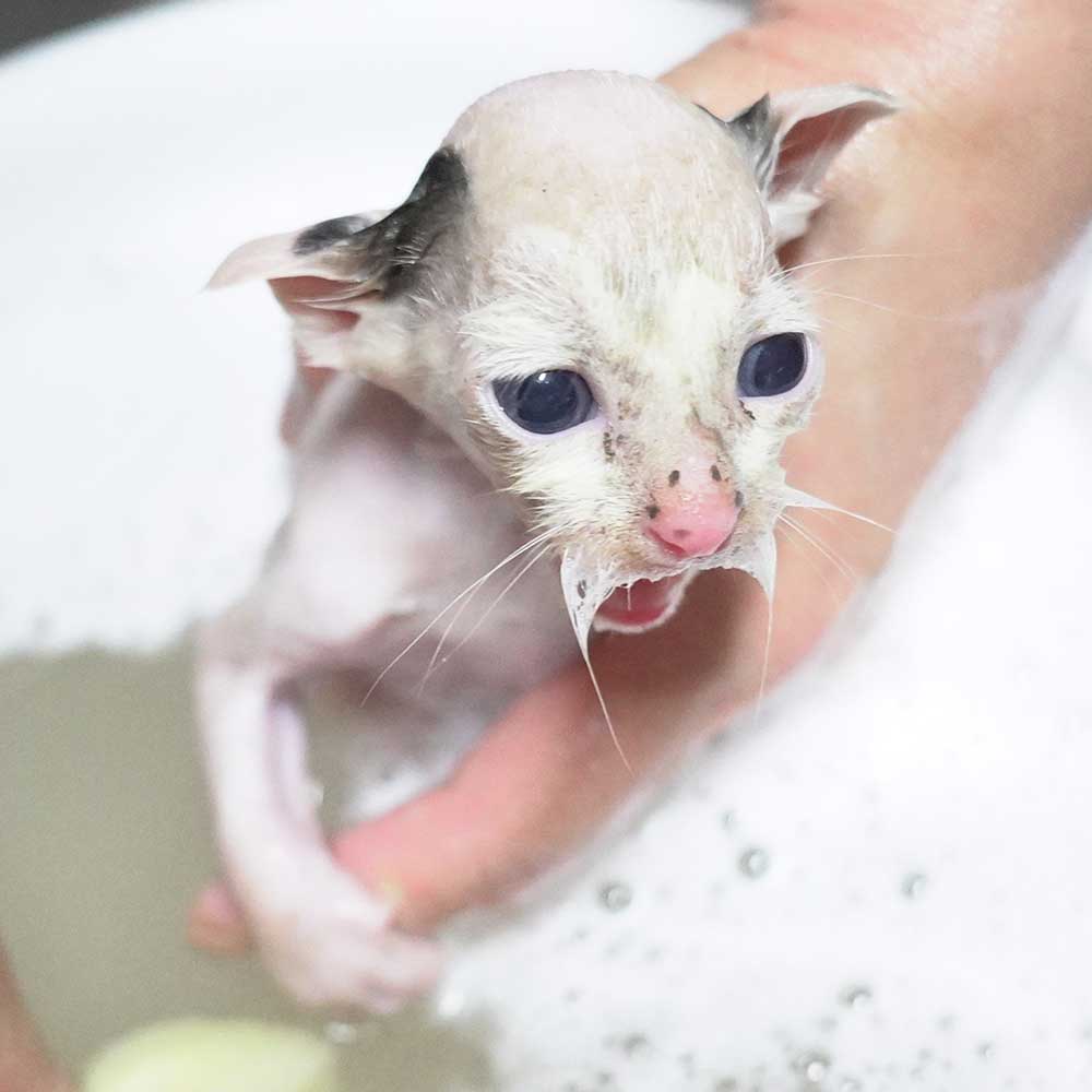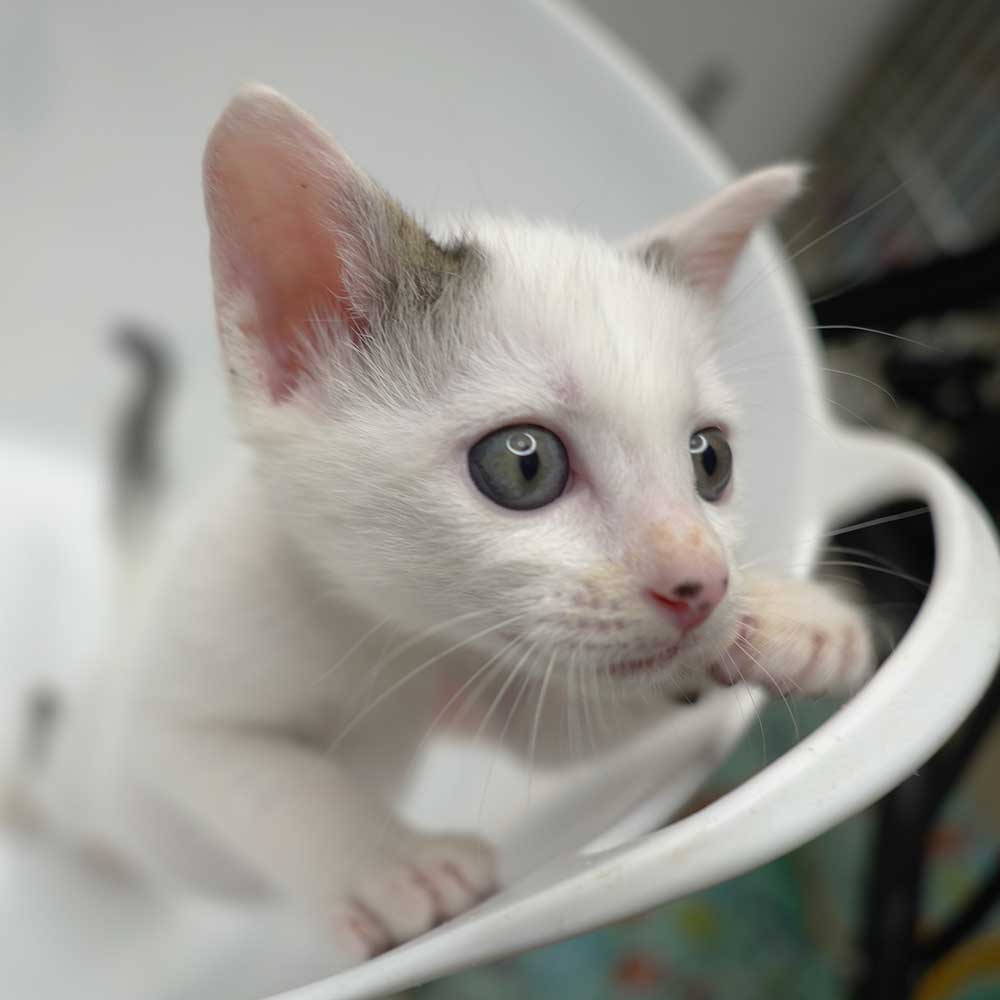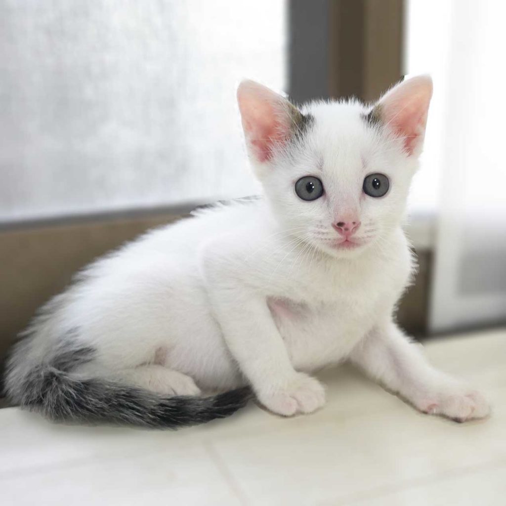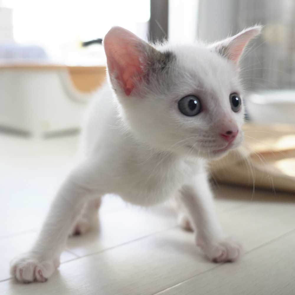 ある激しい雨の日、民家の裏手で2日待っても母猫が帰ってこず、お腹を好かせて鳴いているところを保護。