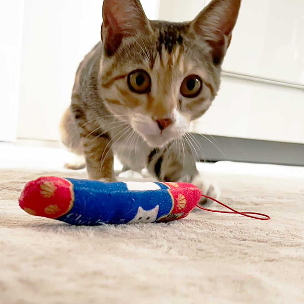 チュールの形をしたおもちゃが大好きでいつも興奮しながら遊んでいます。